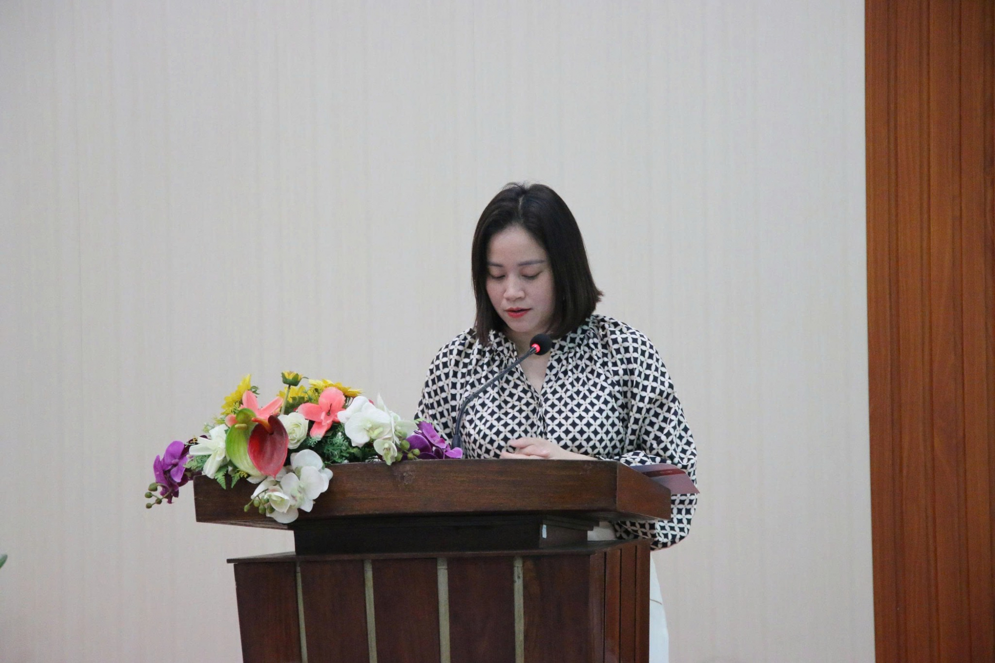 Cô Trần Thị Phương, Trưởng ban Hợp tác doanh nghiệp và Tư vấn việc làm sinh viên phát biểu tại buổi lễ