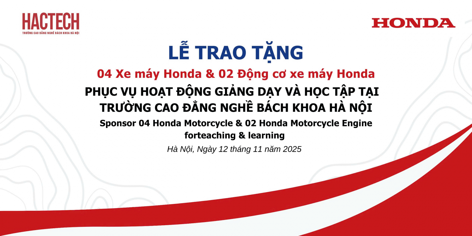 Ngày 12/11/2025, Honda Việt Nam sẽ tổ chức lễ trao tặng thiết bị thực hành cho Trường Cao đẳng nghề Bách khoa Hà Nội (HACTECH), bao gồm 04 xe máy và 02 động cơ Honda. Đây là những thiết bị có giá trị thực tiễn cao, hỗ trợ trực tiếp cho công tác giảng dạy và học tập của sinh viên ngành Công nghệ ô tô và kỹ thuật.