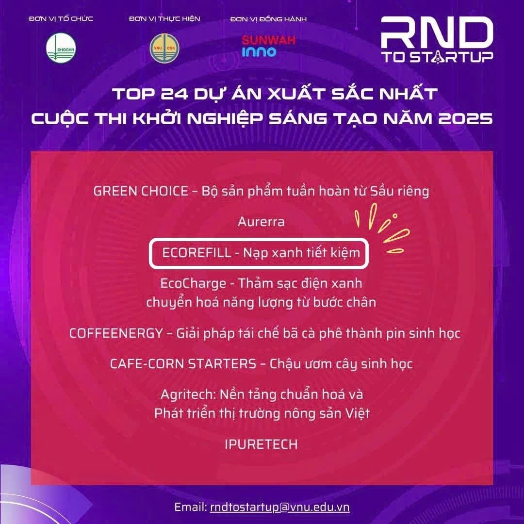 Dự án mang tên ECOREFILL - Nạp xanh tiết kiệm của nhóm sinh viên HACTECH đã xuất sắc cùng 24 dự án khác vượt qua hàng trăm dự án tham gia vòng 1 của cuộc thi. Cuộc thi do Đại học Quốc gia Hà Nội tổ chức, Trung tâm Chuyển giao tri thức và hỗ trợ Khởi nghiệp (VNU) là đơn vị thực hiện, và đơn vị đồng hành là Sunwah Inno.