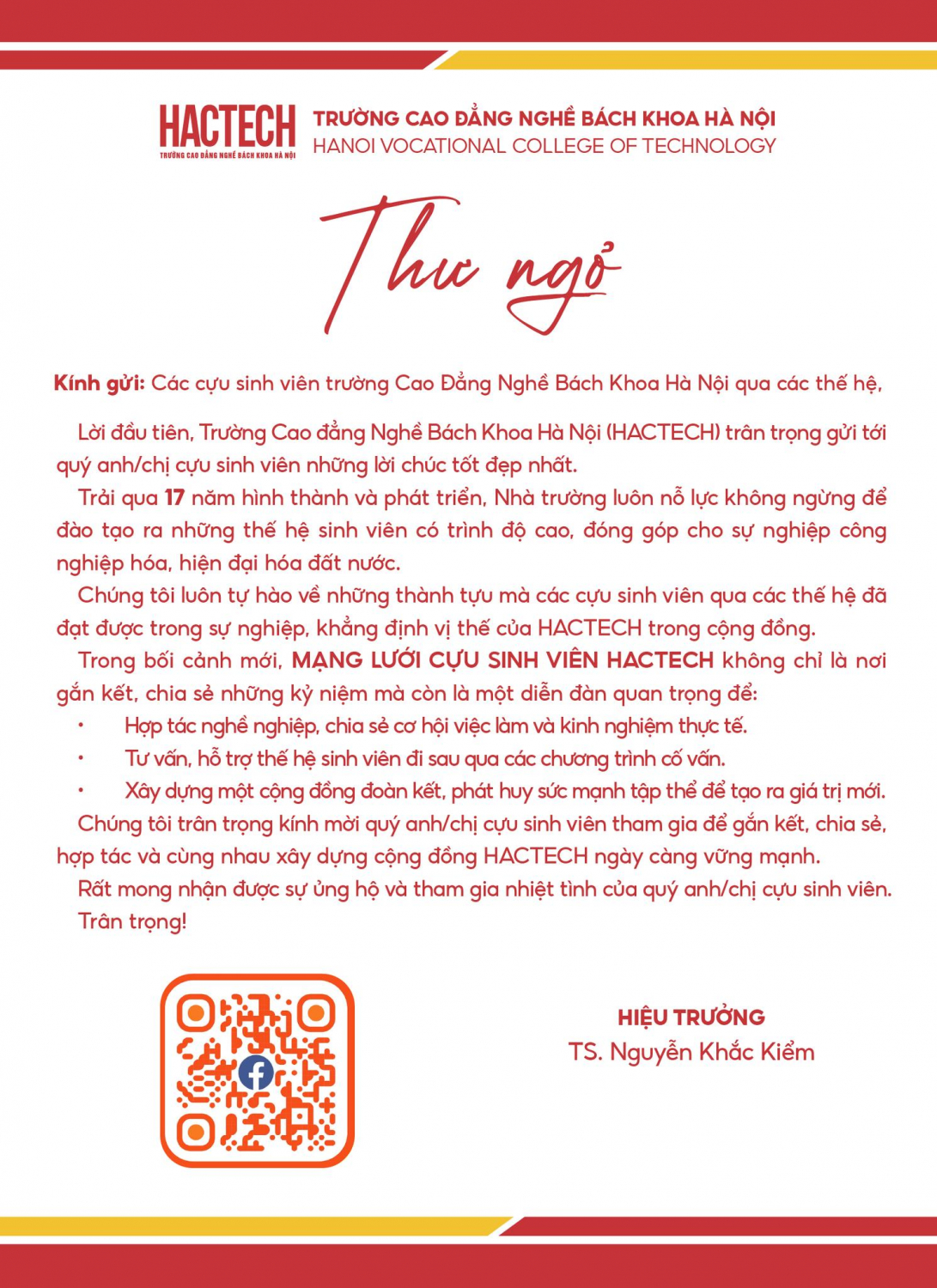 Để tăng cường sự gắn kết và hỗ trợ nghề nghiệp cho các thế hệ sinh viên nhằm xây dựng một cộng đồng đoàn kết, phát huy sức mạnh tập thể, TS. Nguyễn Khắc Kiểm - Hiệu trưởng Nhà trường gửi Thư ngỏ động viên, khích lệ quý anh/chị cựu sinh viên tham gia Mạng lưới Cựu sinh viên HACTECH.