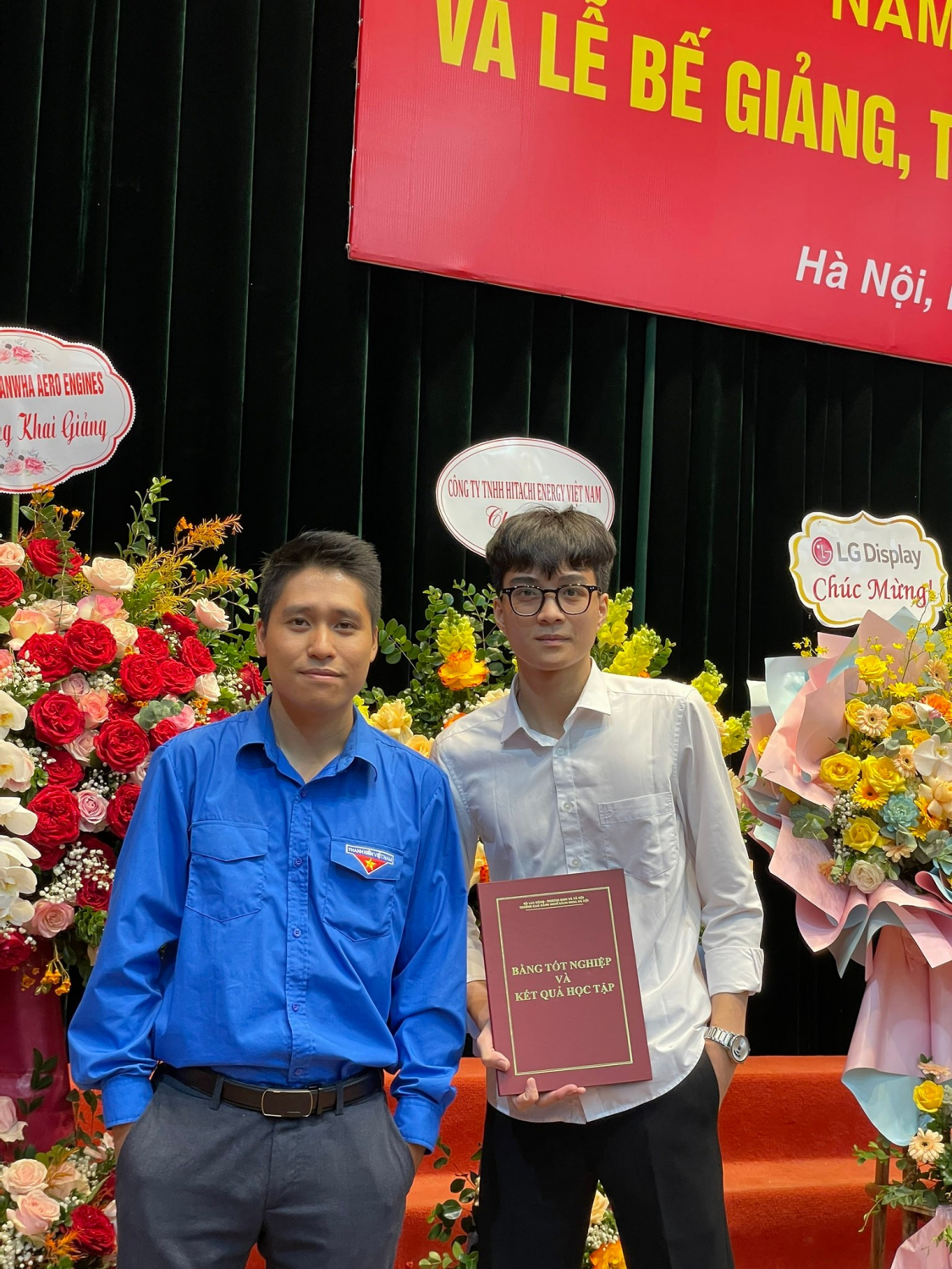 Cựu sinh viên Lê Xuân Thao và thầy chủ nhiệm Nguyễn Xuân Việt trong ngày nhận bằng tốt nghiệp