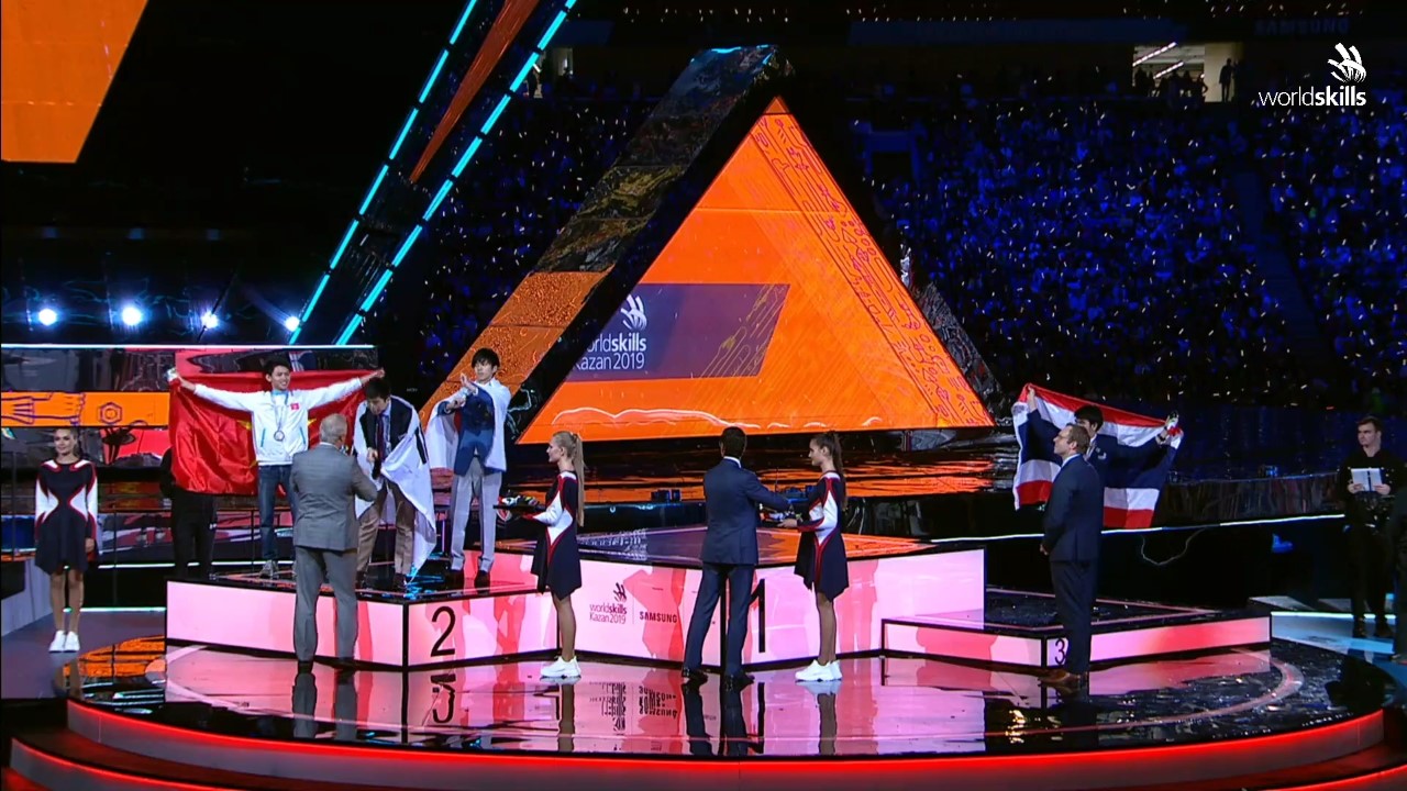 Thí sinh Trương Thế Diệu – DENSO Việt Nam (Sinh viên k7 Cao đẳng Nghề Bách khoa Hà nội) nhận huy chương bạc nghề Phay CNC tại Kỳ thi Tay nghề Thế giới - Kazan 2019 (bên trái)