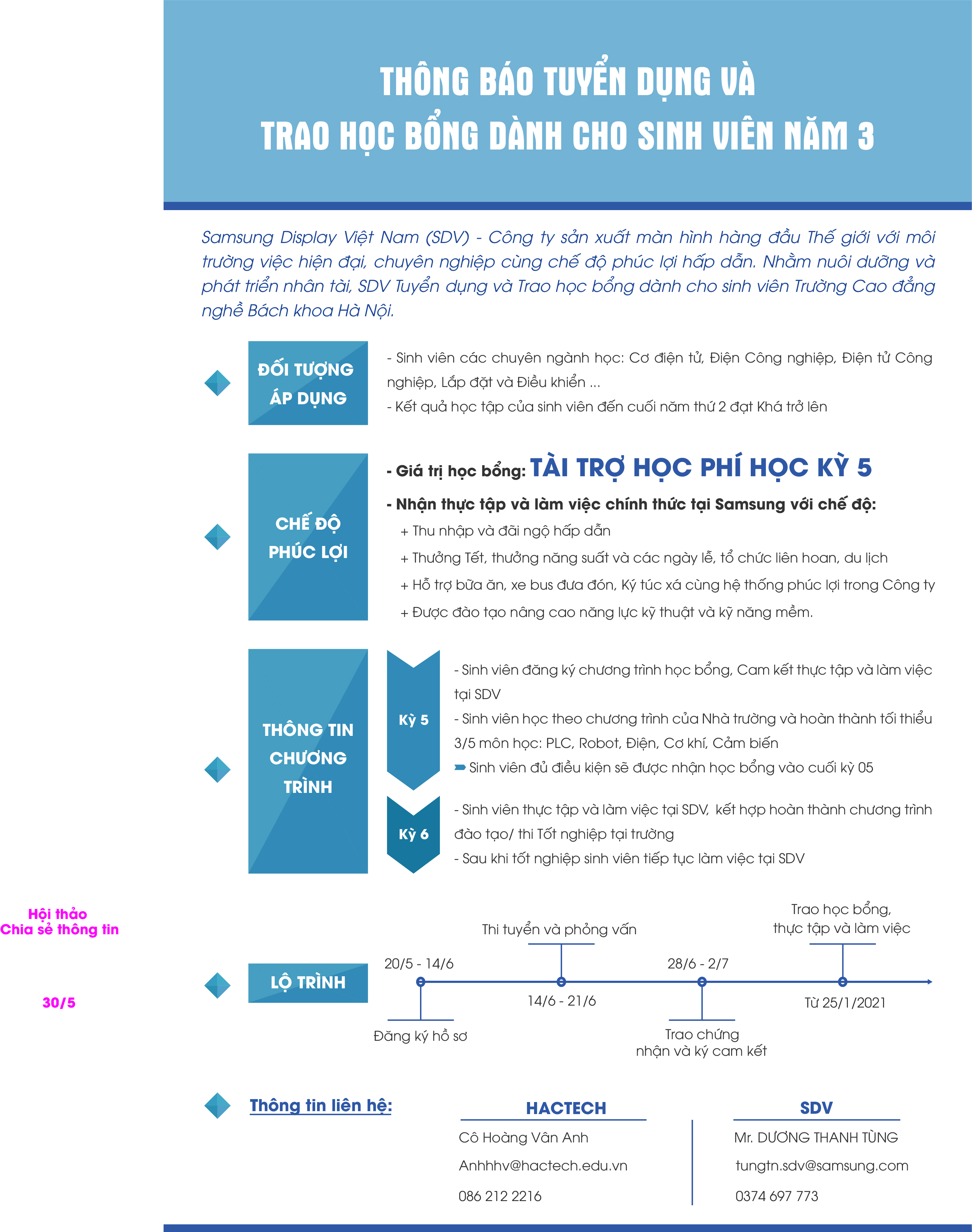 Chương trình tài trợ học bổng trị giá 5 kỳ của công ty Samsung Display (SDV) giành cho các bạn sinh viên K10 nghề Cơ điện tử, Điện công nghiệp, Điện tử công nghiệp, Lắp đặt và bảo dưỡng... có kết quả học tập kỳ 2 từ loại Khá trở lên.