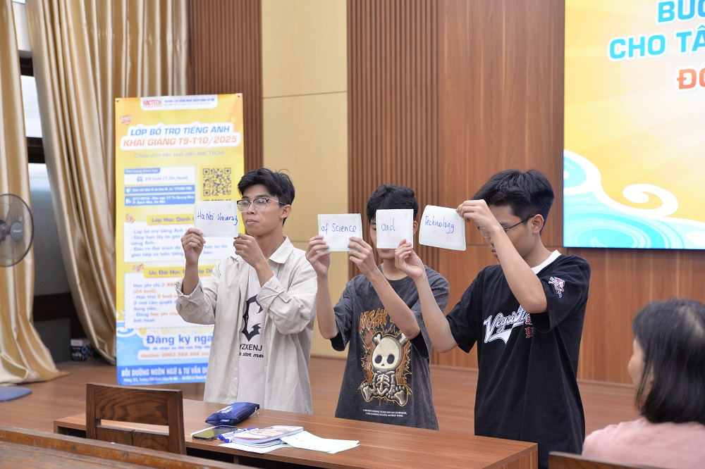 Trước sự gợi mở của cô giáo, các bạn sinh viên đã hăng hái tham gia trả lời nhanh các câu hỏi như tên viết tắt bằng tiếng Anh của Đại học Bách khoa Hà Nội, của Trường cao đẳng nghề Bách khoa Hà Nội. Từ đó sinh viên thấy được rằng tiếng Anh hiện hữu trong mọi lĩnh vực cuộc sống, biết tiếng Anh sẽ giúp bạn thuận tiện hơn trong công việc và là công cụ để kết nối với người ngoại quốc.