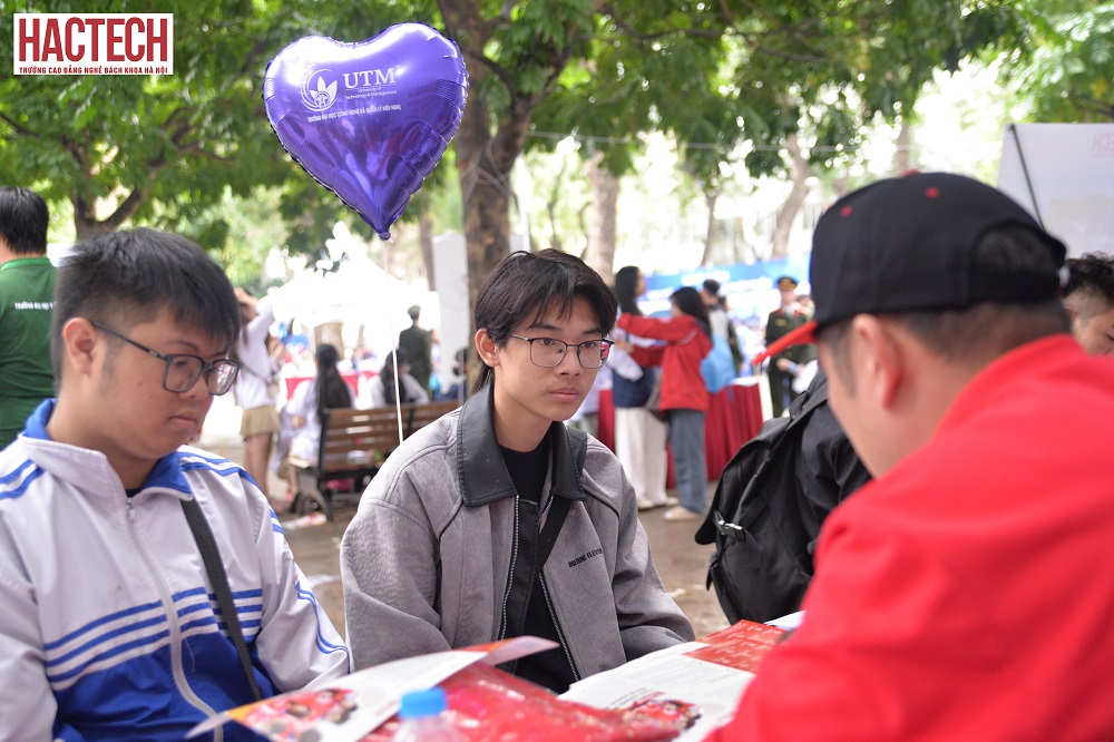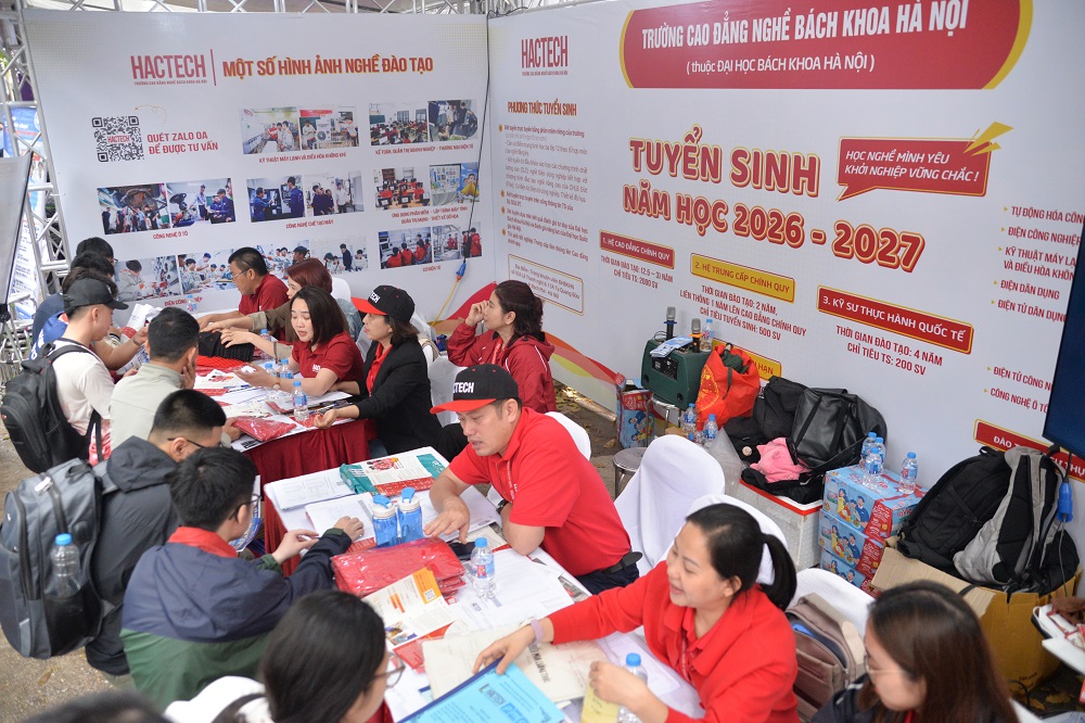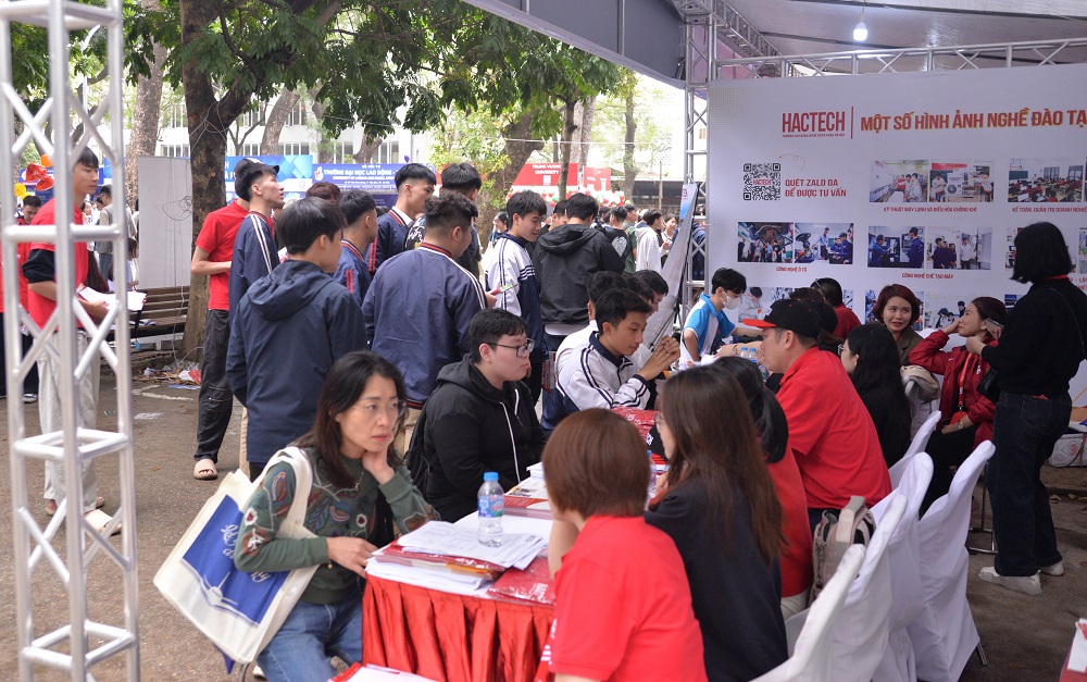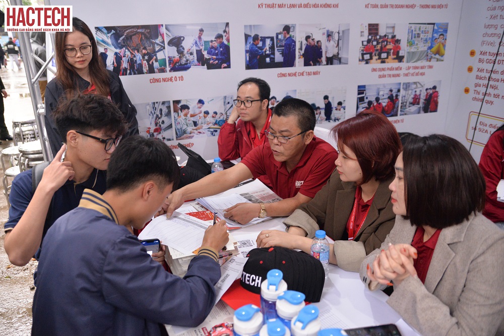Tại ngày hội, gian tư vấn của Trường Cao đẳng nghề Bách khoa Hà Nội (HACTECH) đã nhận được sự quan tâm đặc biệt từ đông đảo học sinh và phụ huynh. Ngay từ đầu chương trình, nhiều thí sinh đã chủ động đến tìm hiểu thông tin tuyển sinh, chương trình đào tạo, cơ hội việc làm cũng như môi trường học tập tại nhà trường. Đội ngũ cán bộ, giảng viên và sinh viên của HACTECH đã trực tiếp tư vấn, giải đáp các thắc mắc của học sinh về ngành nghề đào tạo, thời gian học, cơ hội thực tập và việc làm sau tốt nghiệp.