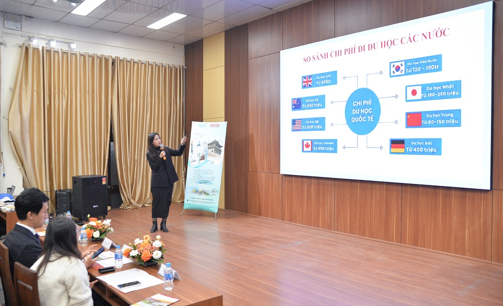Sau phần phát biểu của TS. Nguyễn Tiến Long, thay mặt cho Trung tâm ACES, cô Ninh Thị Hà Thu đã giới thiệu tổng quan về môi trường học tập và làm việc tại Hàn Quốc. Cô Hà Thu từng có nhiều năm học tập và làm việc tại Hàn Quốc theo diện học bổng nên am hiểu rất kỹ về đất nước Hàn Quốc.