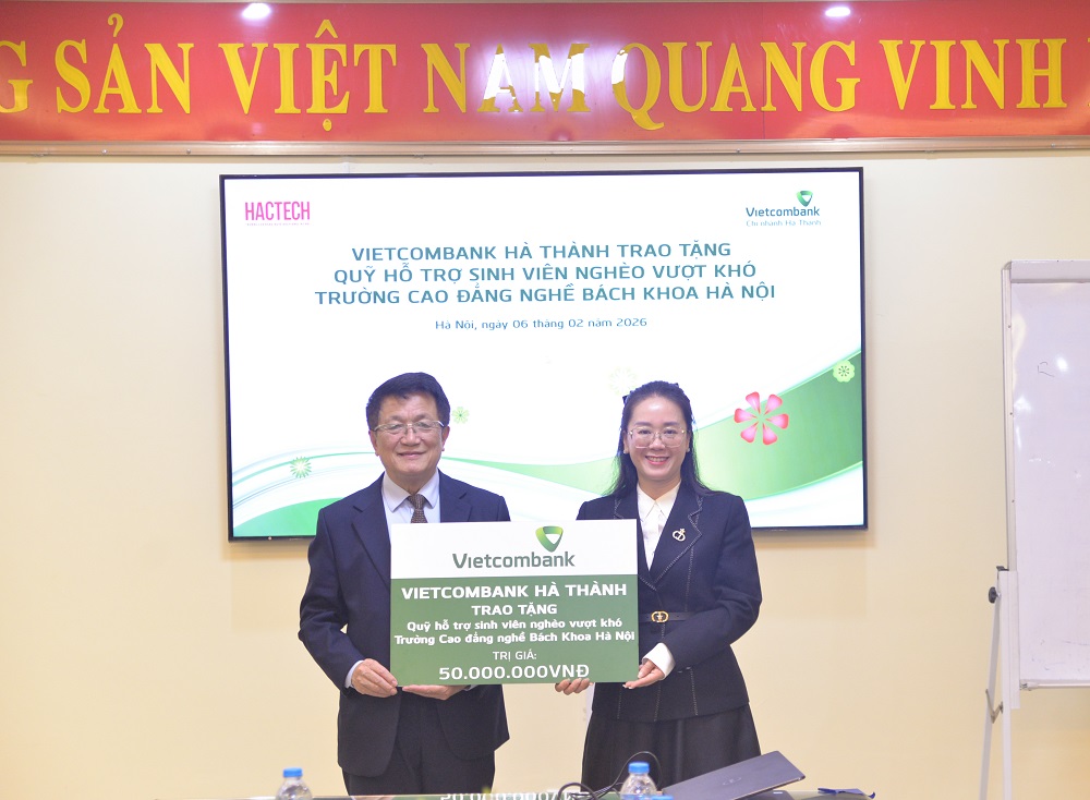 Ngày 6/2, đại diện Vietcombank Chi nhánh Hà Thành đã trao tặng 50 triệu đồng cho Quỹ hỗ trợ sinh viên nghèo vượt khó của Nhà trường, tiếp thêm động lực cho những sinh viên có hoàn cảnh khó khăn nỗ lực vươn lên trong học tập và rèn luyện.