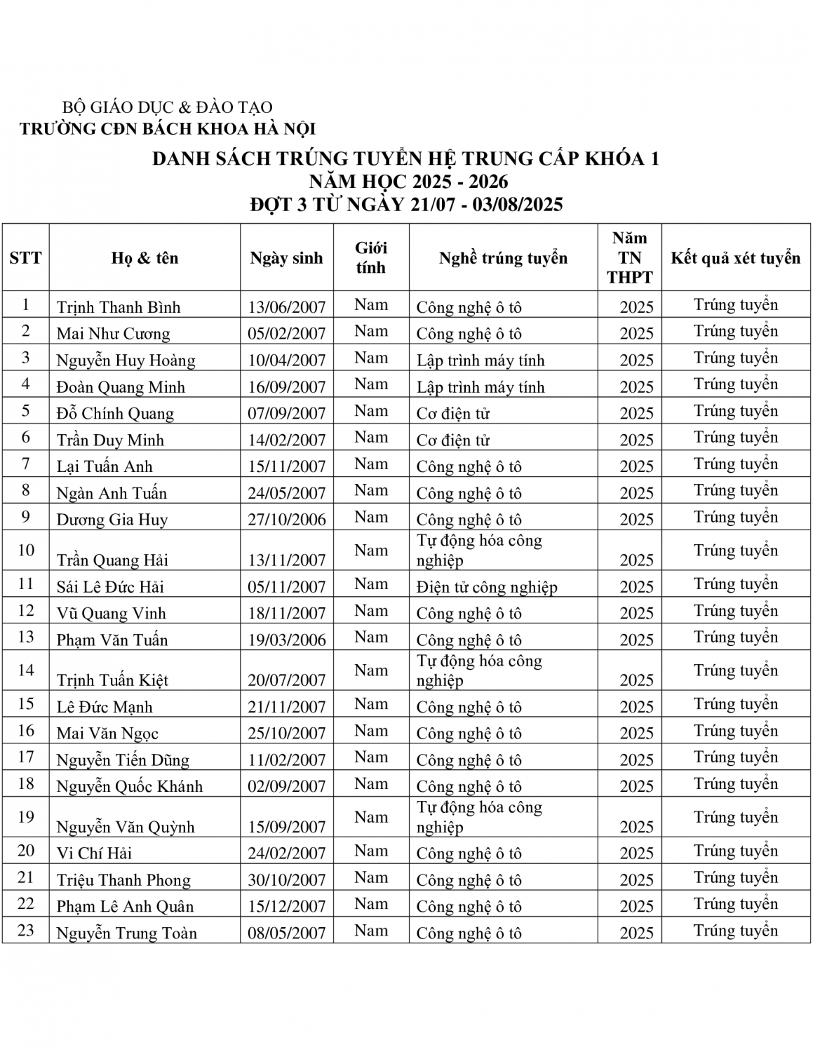 211 thí sinh đã trúng tuyển hệ trung cấp khóa 1 tại Trường cao đẳng nghề Bách khoa Hà Nội đợt 3 (từ 21/7-3/8)