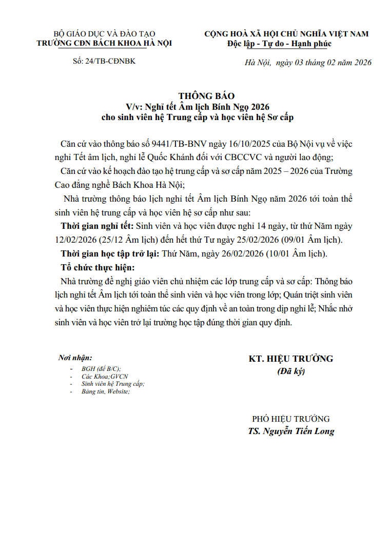 Trường Cao đẳng nghề Bách khoa Hà Nội thông báo lịch nghỉ tết nguyên đán Bính Ngọ 2026 với hệ trung cấp và sơ cấp như sau: